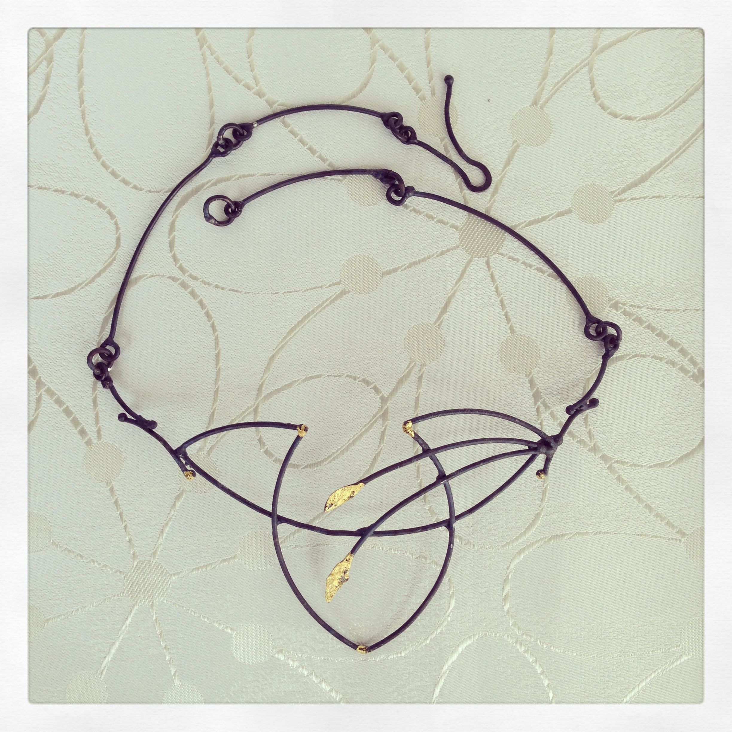 black jewellery neckpiece on white ← Previous Next → Black jewellery neckpiece, Welded steel and gold leaf. varnish sealed Black jewellery neckpiece, Welded steel and gold leaf. varnish sealed
